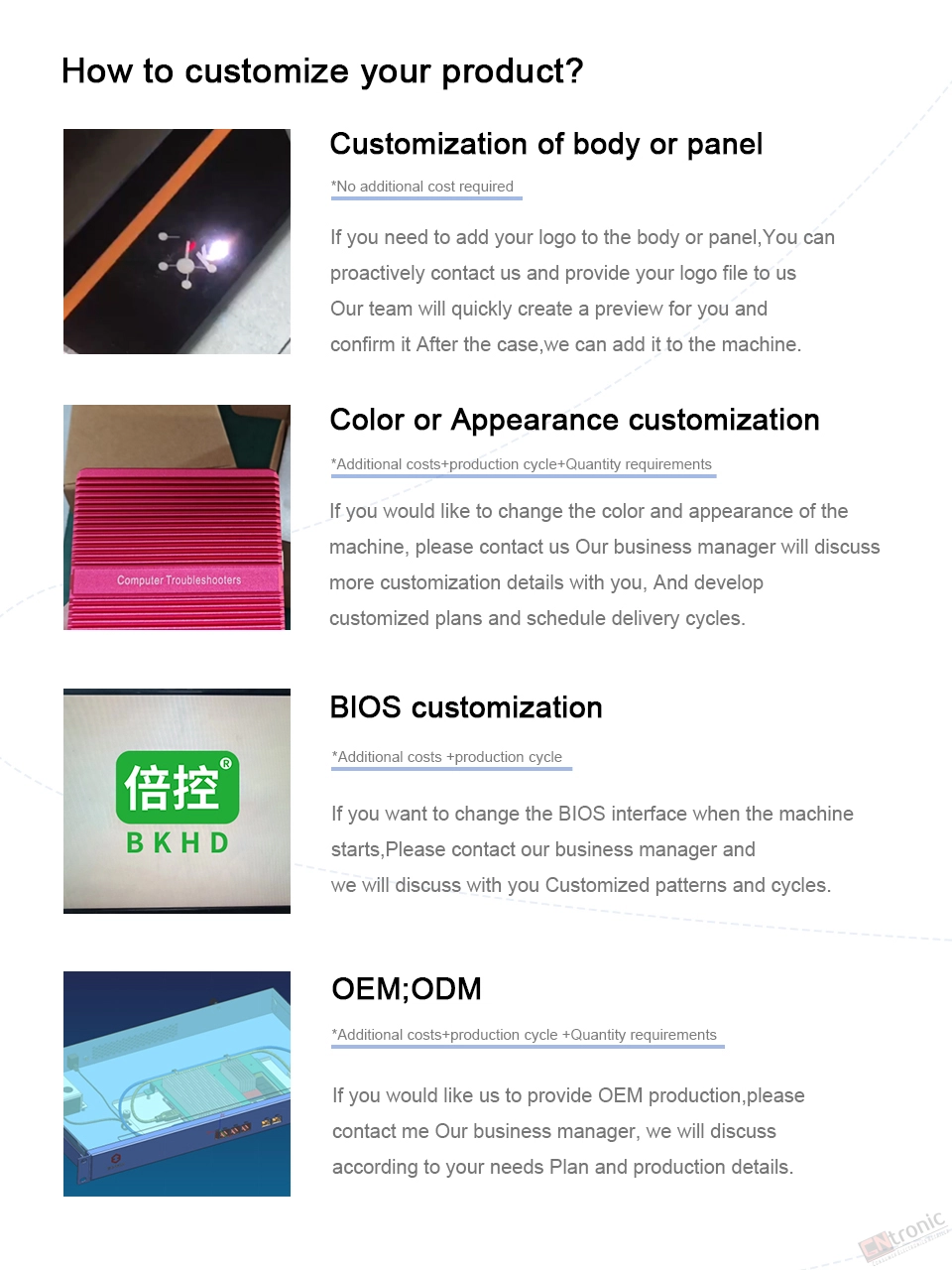For replacement/custom configuration or making exclusive chassis, BIOS-files, packaging boxes, and designated pre-installed systems, please contact our business personnel.