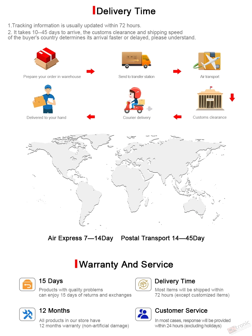 Cntronic shipping (Post) arrives at your address in 10-15 days (some countries need to clear customs by Buyer); Brazil arrives at your address in 20-25 days.