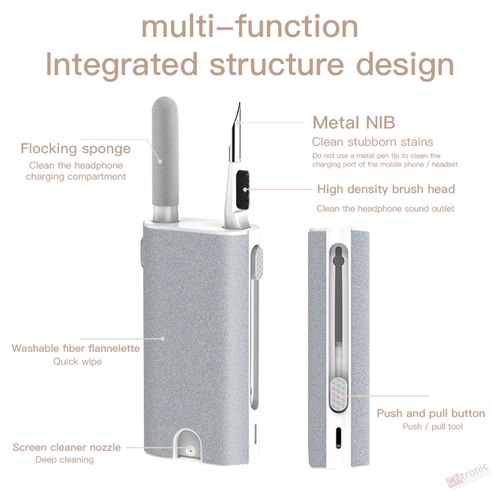 Q6 5 in 1 Cleaner Kit Multifunctional Earbuds Cleaning Pen Dust Removal Brush Bluetooth-compatible Earphones Case Mobile Phone Cleaning Tools with Spray Port Grey