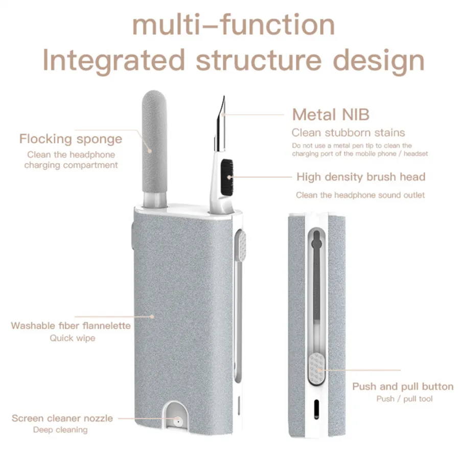 Q6 5 in 1 Cleaner Kit Multifunctional Earbuds Cleaning Pen Dust Removal Brush Bluetooth-compatible Earphones Case Mobile Phone Cleaning Tools with Spray Port Grey Feature: Multifunctional 5-in-1 integrated design: with flocked brush head, flocked sponge stick, cleaning cloth, metal nib, cleaner spout (without cleaning spray) Metal nib: It can clean the stubborn dust and stains in the gap of the mobile phone or earphone without hurting the charging port High-density flocking brush head: three-dimensional high-density flocking, easy to clean earphone/phone sound hole and other parts Flocking sponge stick: Delicate and soft flocking sponge cleans the charging compartment of the earphone box, decontamination does not leave any residue With screen cleaner spray port: You can use your own cleaning spray to clean the stains deeply, press down to spray the cleaner Washable Fiber Flannel: Wipe up quickly and stay as clean as new. Specially contains sterilization factor, no alcohol and no irritation, remove dangerous grease, fingerprints, etc. Sliding design: push-pull button design, save space, can be retracted when not in use, easy to carry Mini and compact: 3.8*7.5*1.8CM size, clever design, compatible with a variety of devices Wide compatibility: Can clean a variety of devices, such as headphones, mobile phones, tablets, laptops, TVs and other digital devices Specification: Name: Q6 5 in 1 Multifunctional Cleaning Kit Material: ABS + metal + sponge + microfiber cloth Color: grey Function: Deep clean a variety of digital devices Weight (without detergent): 40g Size: 3.8*7.5*1.8CM Packing size: 9.5*5.5*2CM Note: Does not contain cleaning spray. Due to the different monitor and light effect, the actual color of the item might be slightly different from the color showed on the pictures. Thank you! Please allow 1-2cm measuring deviation due to manual measurement. ![]()