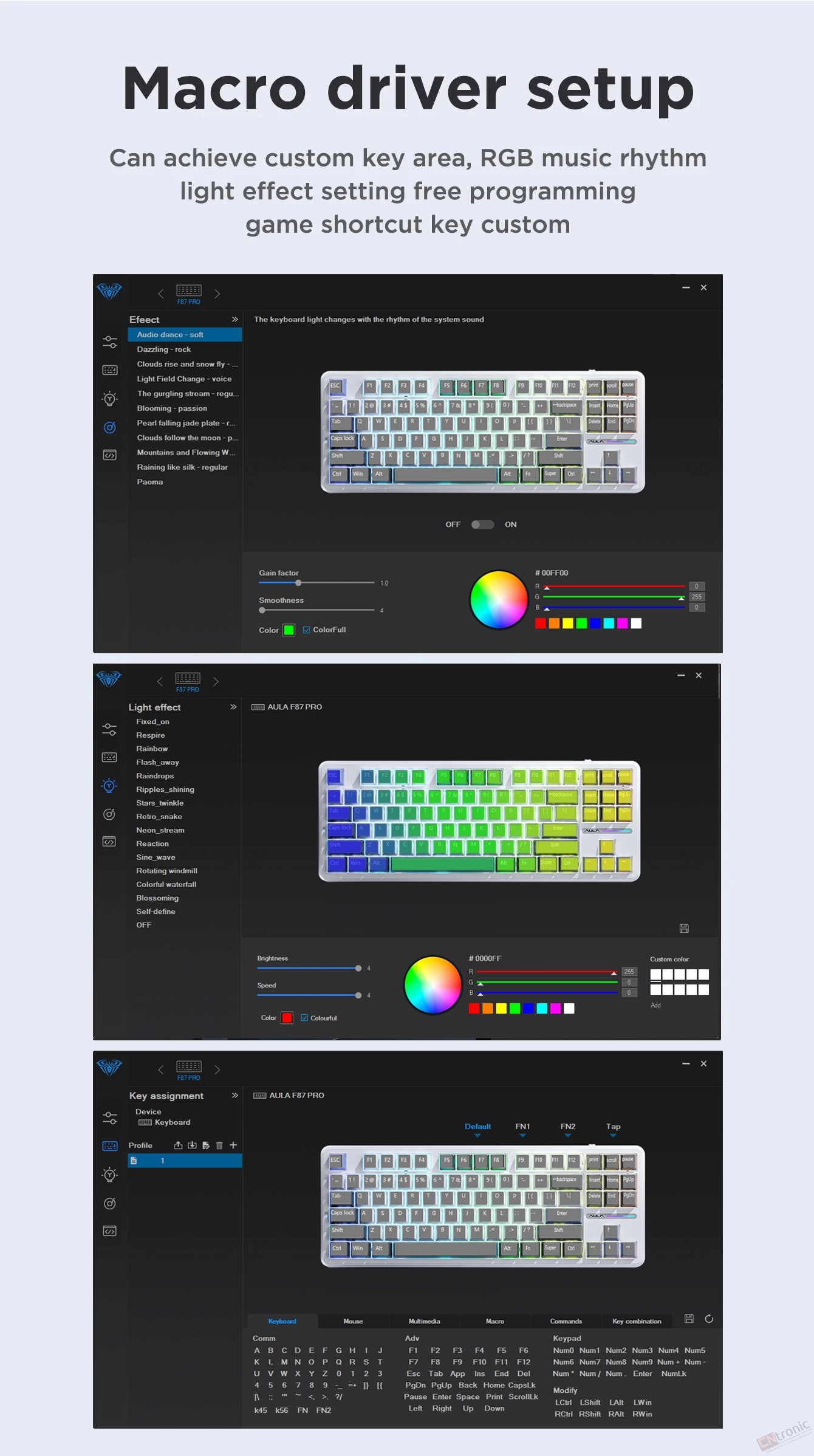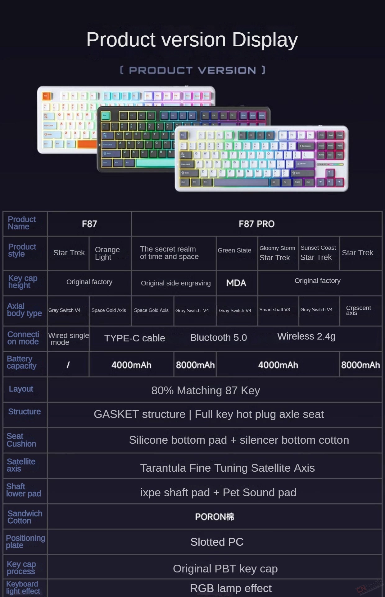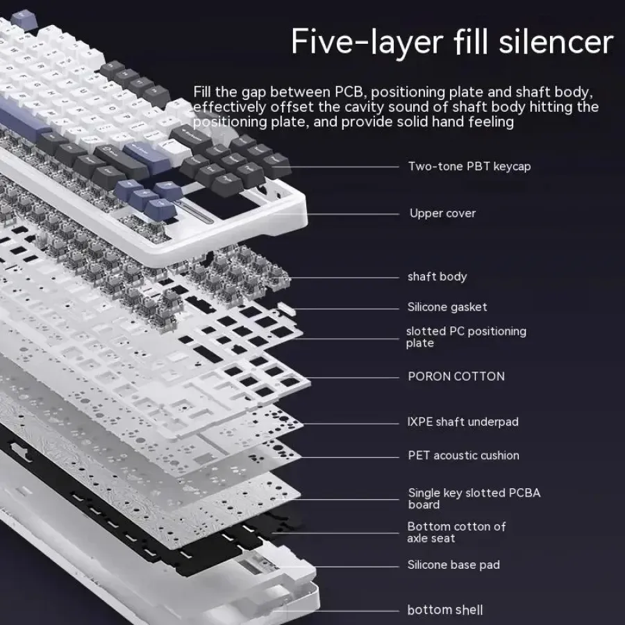 There are various keyboard shaft options, including stable gray wood shaft and agile flexible shaft V3, to meet different typing habits. Whether you are an e-sports expert or an office expert, you can find the most comfortable typing feeling F87pro adopts Gasket structure, which enhances the stability of the mechanical keyboard and makes the keys rebound more quickly.