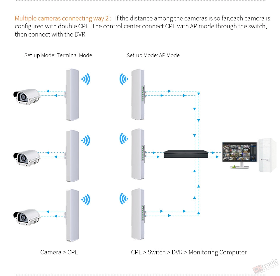 Multiple cameras connecting way 2 : If the distance among the cameras is so far , each camera is configured with double CPE . The control center connect CPE with AP mode through the switch ,then connect with the DVR