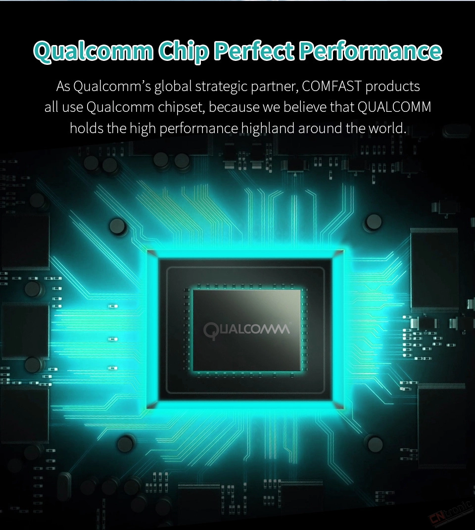As Qualcomm's global strategic partner , COMFAST products all use Qualcomm chipset , because we believe that QUALCOMM holds the high performance highland around the world