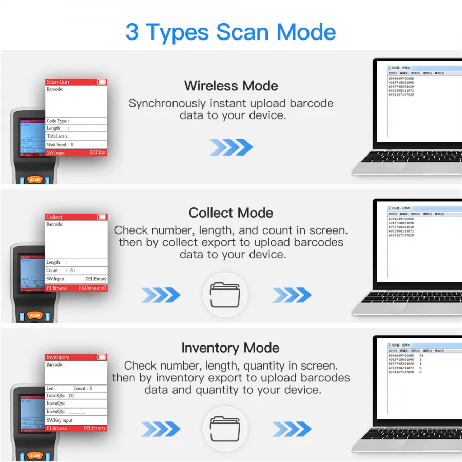 As a Wireless Scanner: Support scan 1D code and instant upload barcode data.