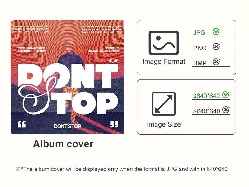 5. Player album cover pixel limit is 640 * 640, if, beyond this pixel, the artist and album may not appear on the screen.