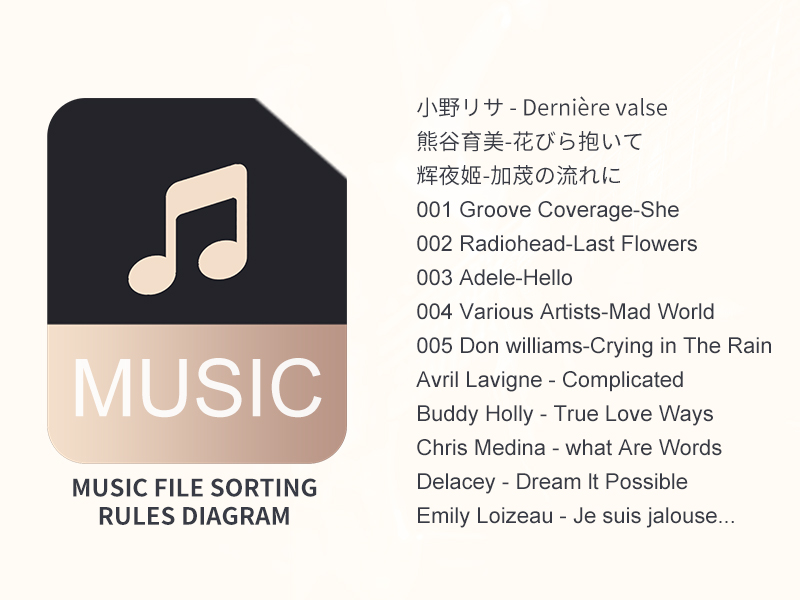In short: music names are displayed first in Chinese/Japanese, followed by lowercase to uppercase numbers, and finally by the letters A-Z in order.