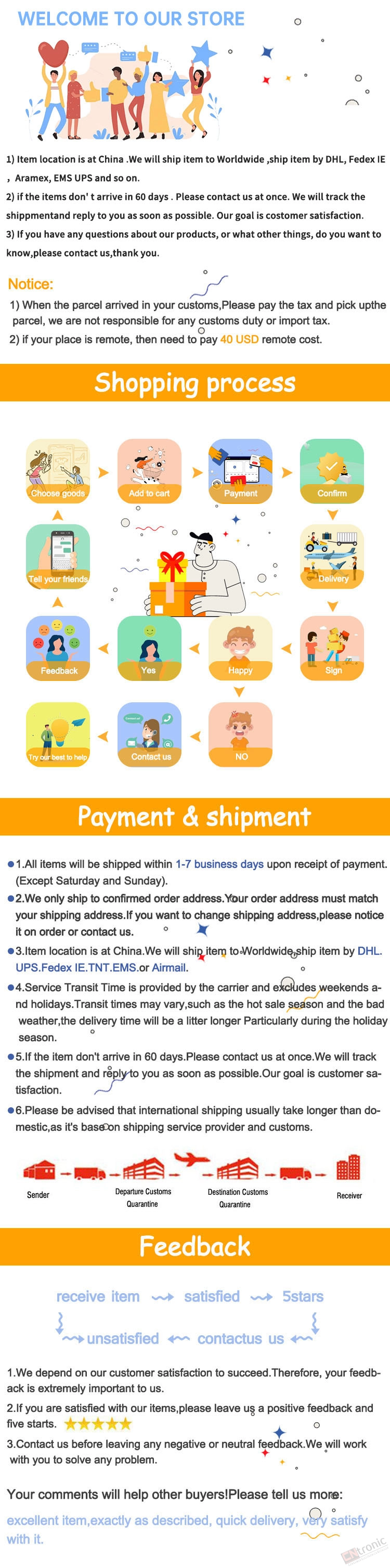 2.When the parcel arrives at your local customs, please pay the tax and take the parcel away. We do not bear any customs duties or import taxes. If the customs fails due to the buyer's reasons and the goods are returned or destroyed, we will not refund any money.
