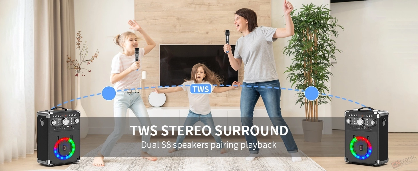 LED Light Show & TWS Mode Pairing: Transform any space into a vibrant concert hall with the built-in LED light show! The dynamic lights pulse and dance to the music, creating an immersive and unforgettable karaoke experience. Pair 2 speakers via TWS for 360° stereo immersion