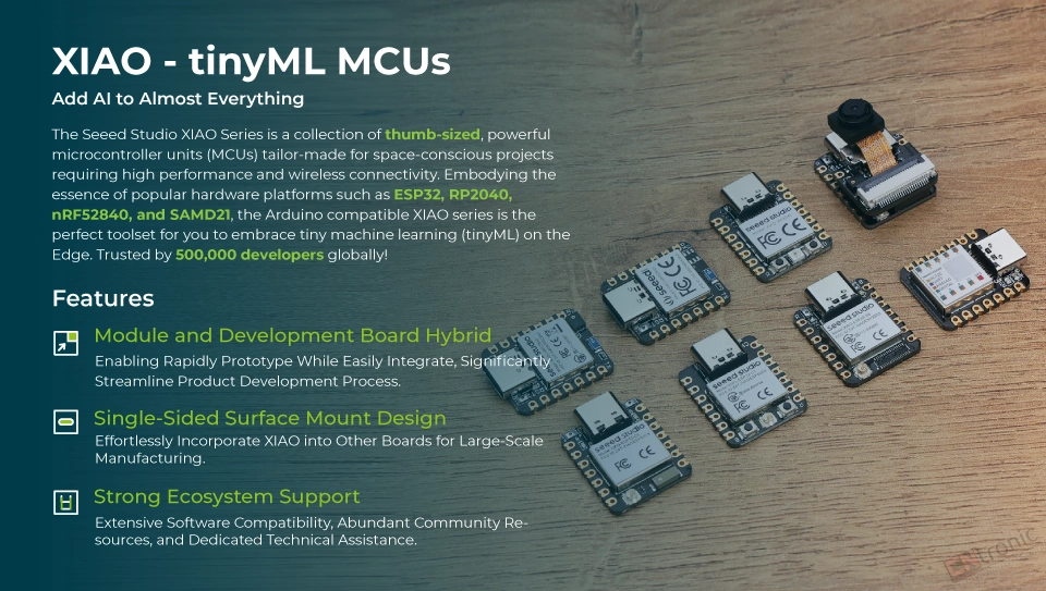 21 x 17.5mm, adopting the classic form factor of XIAO, suitable for space limited projects like wearable devices.