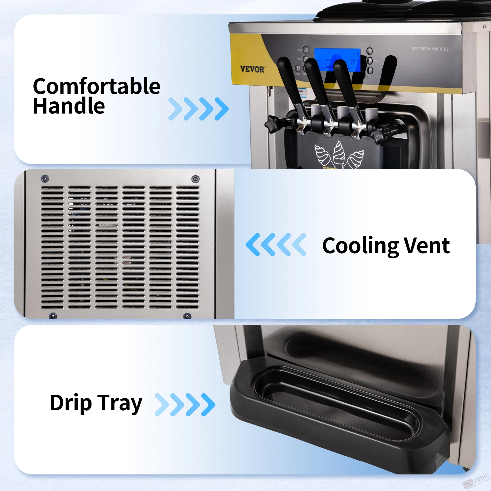 Smart LCD Control Panel: Our soft-serve ice cream maker is equipped with a smart digital panel, so you can be in constant control. The quantity of ice cream is displayed on the LCD screen for direct observation. Practical functions are also featured here. You can set the ice cream firmer or softer according to your taste. With the fresh-keeping function, you can put the ingredients in the hopper overnight and enjoy a tastier ice cream. Even more surprisingly, self-cleaning can be activated with just one click.