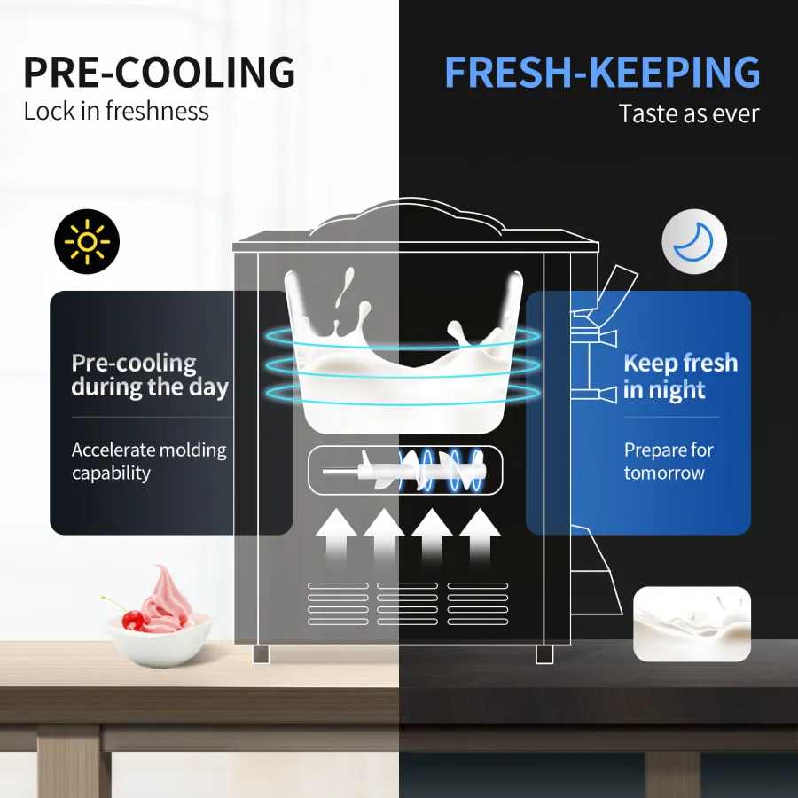 Pre-cooling & Fresh-keeping: When making ice cream, pressing the KEEP-FRESH function can keep the hopper at a lower temperature, and the foam layer inside the machine can be insulated to avoid the materials in the hopper from deteriorating in overheated weather, to ensure the freshness of the ingredients the next day and maintain the taste of ice cream.