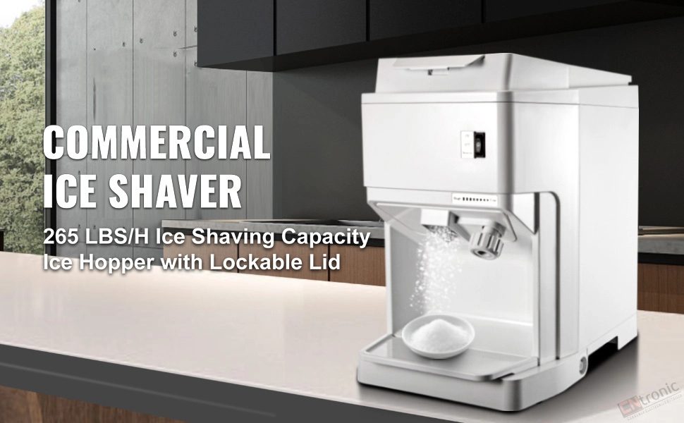 250 W Motor & 265 LBS/H Yield: Our electric ice shaver machine features efficient ice shaving and high hourly yield thanks to the powerful motor and triple-blade design. Fueled by the 250W copper motor, whose rotating speed reaches 320 r/min, our shaved ice maker can produce 265 lbs (120 kg) per hour, meeting the urgent demands quickly in a relatively short time. The built-in integral triple blades can significantly improve the ice shaving efficiency and stabilize the machine while working.