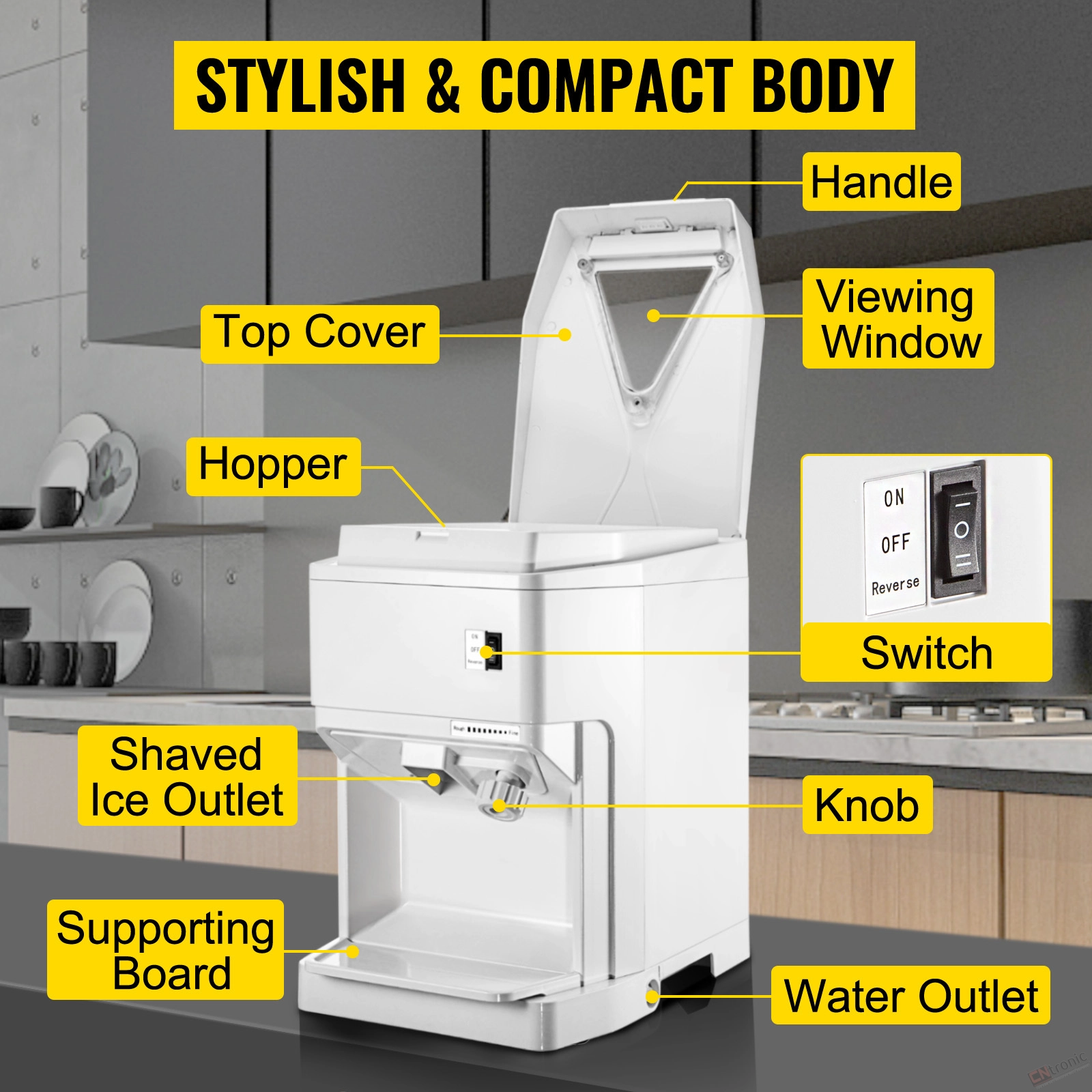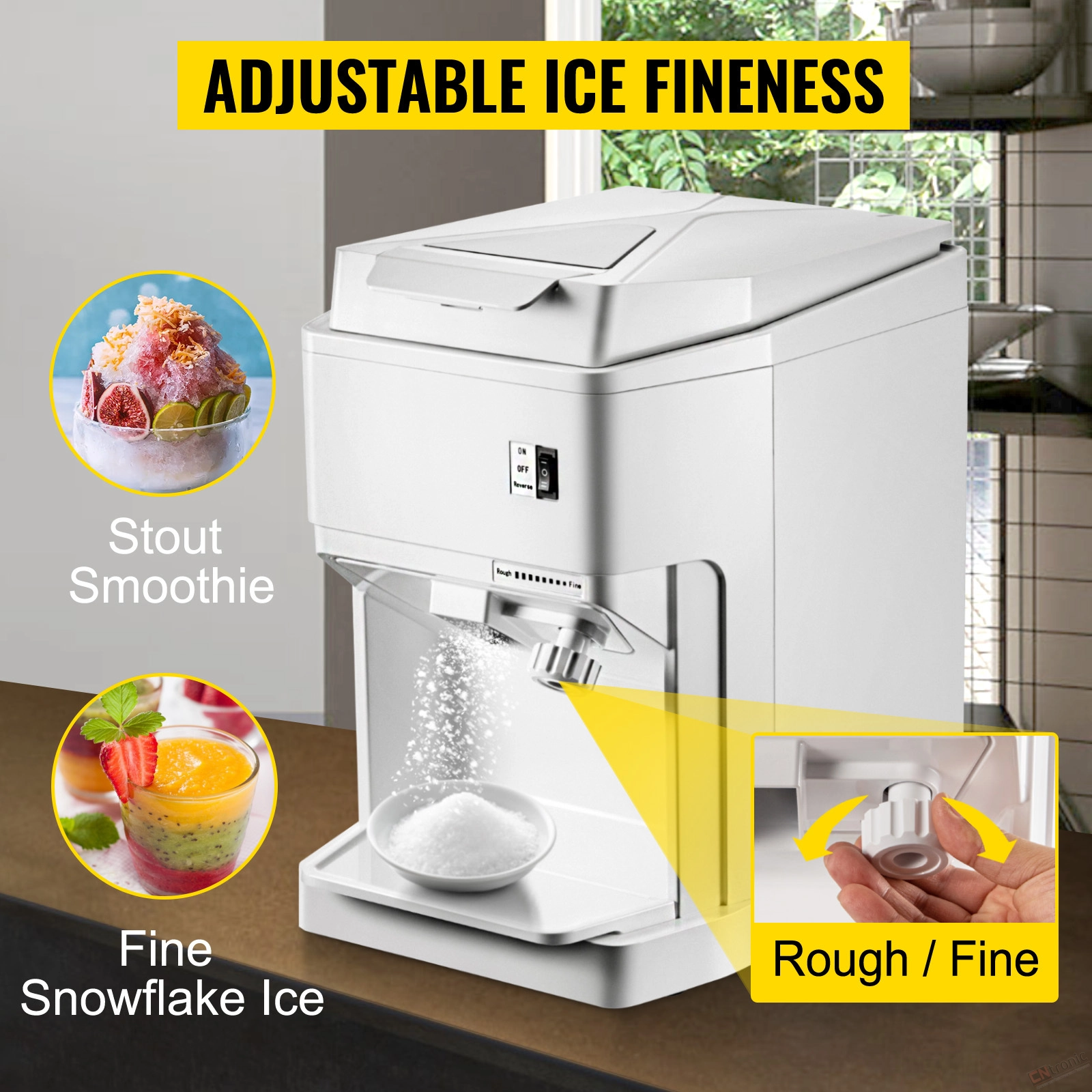 Finer or Rougher Up to You: Our commercial ice shaver is equipped with an easy-to-operate switch, composing ON, OFF, and REVERSE. You can start or stop the machine by pressing down the button. And when the ice cubes getting jammed, you can enable the reverse function to bring it back to normal operation. The adjusting knob allows you to set the shaved ice finer or rougher as you wish. Different fineness serves diverse uses, such as snow cones, chilled drinks, bottom ice for seafood, etc.