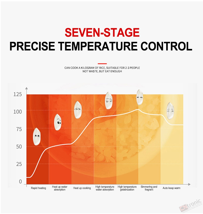 The product liner adopts a separate type, seven-stage precise temperature control. Six major modes: cooking rice, cooking porridge, boiling soup, cooking noodles, and keeping warm. The cover adopts a snap design, sealed snap, and the cover can keep warm.