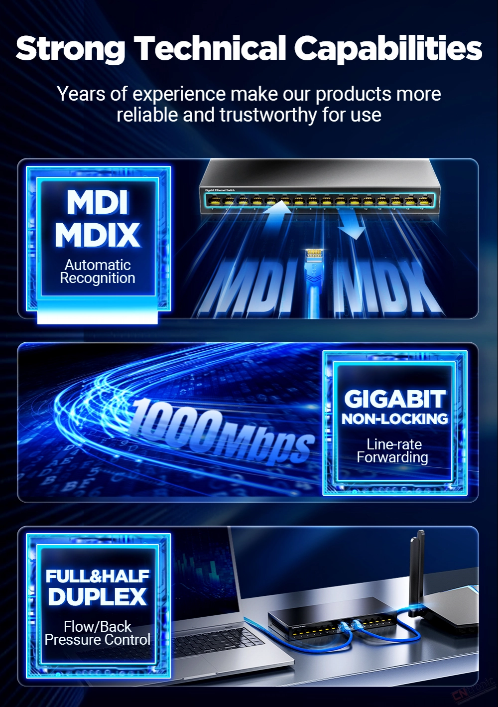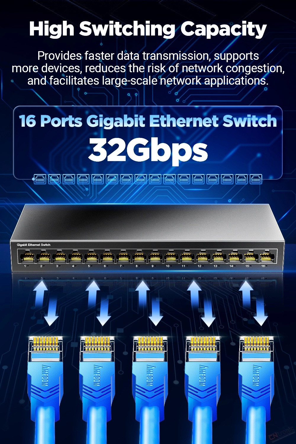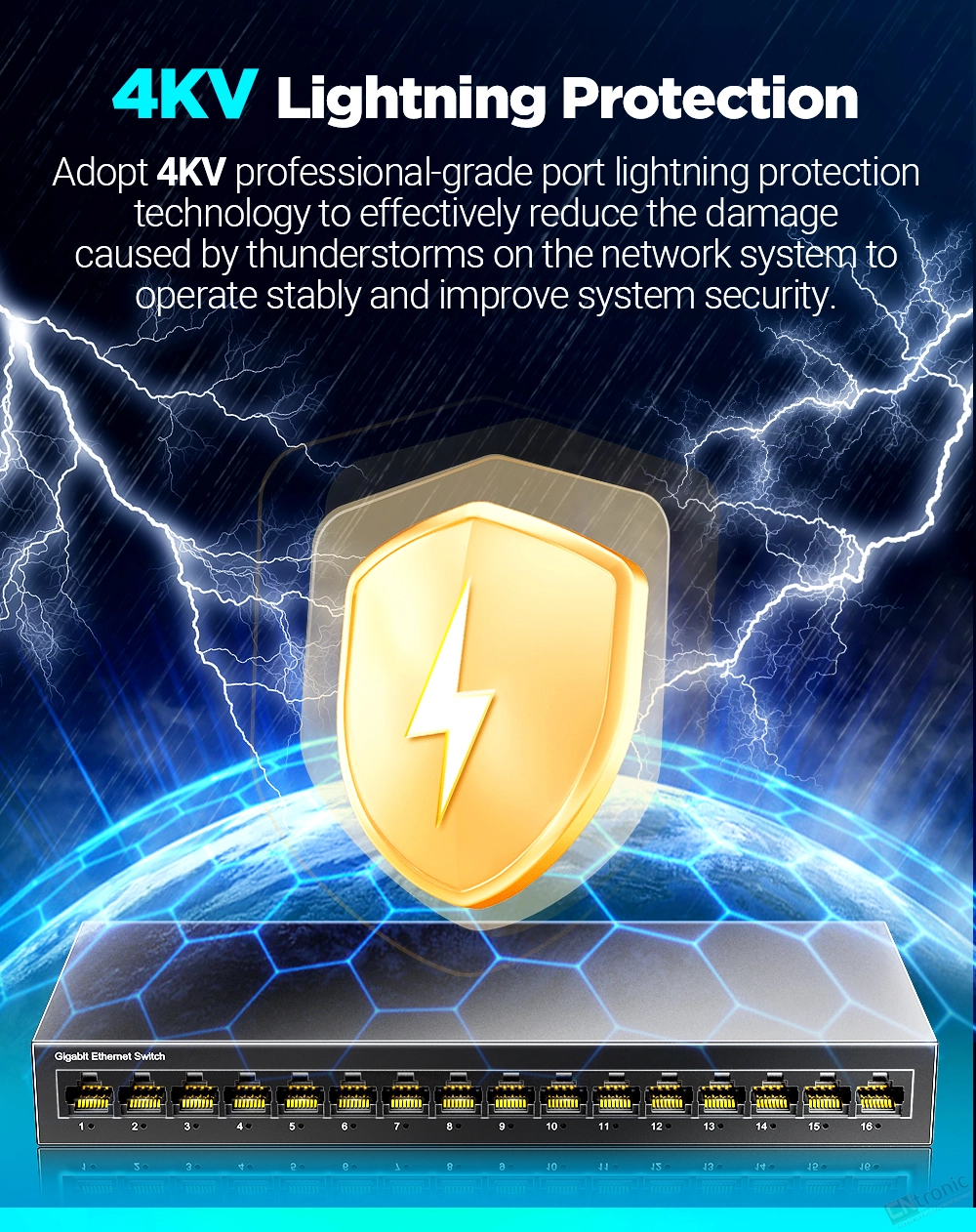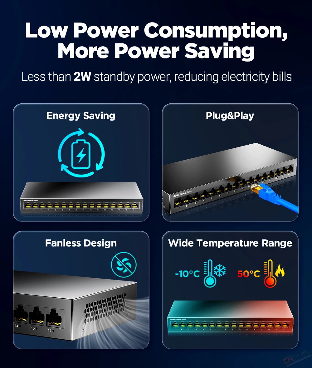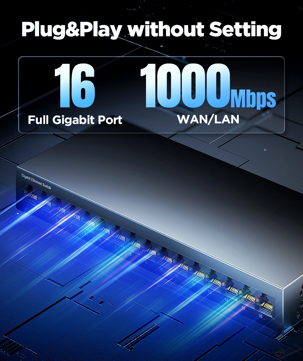 The 16-port Gigabit Ethernet switch adopts high-quality and high-speed network ICs, and this product completely solves the problem of noise of small switches in the office environment through the fanless mute design. This switch has 16 Gigabit RJ45 ports, can provide seamless connection for 10/100/1000M Ethernet, easy to manage and maintain, the product can be widely used in Security network video surveillance, hotel, campus, small and medium-sized enterprise network engineering and other occasions.