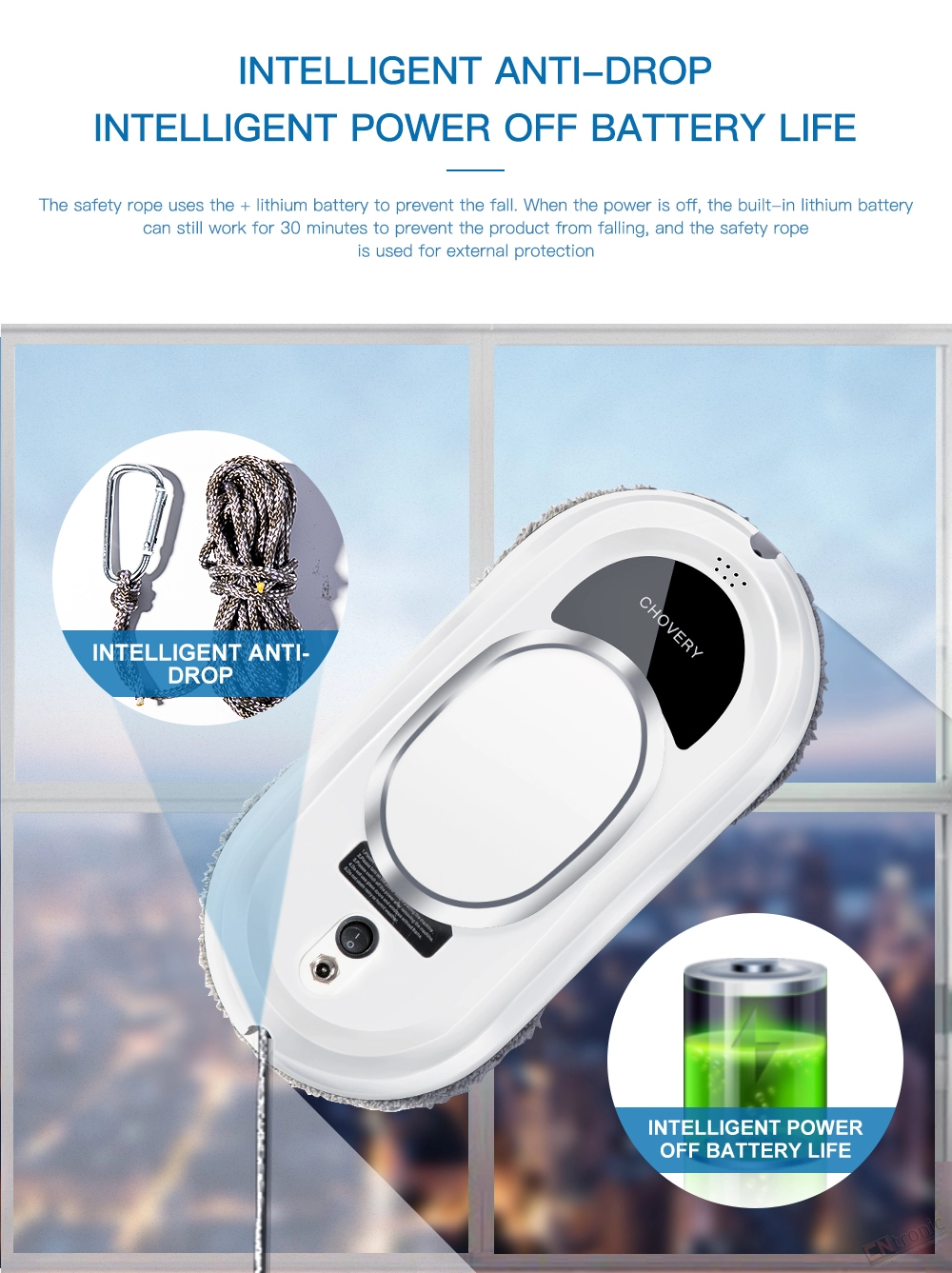 It is recommended to charge the product for more than 2 hours when you get it for the first time, but the robot must be connected to a power source when in use. Charging is just to avoid the robot falling down immediately in case of sudden power failure in your home, you can let it stay on the glass for a period of time, it is designed for your safety.