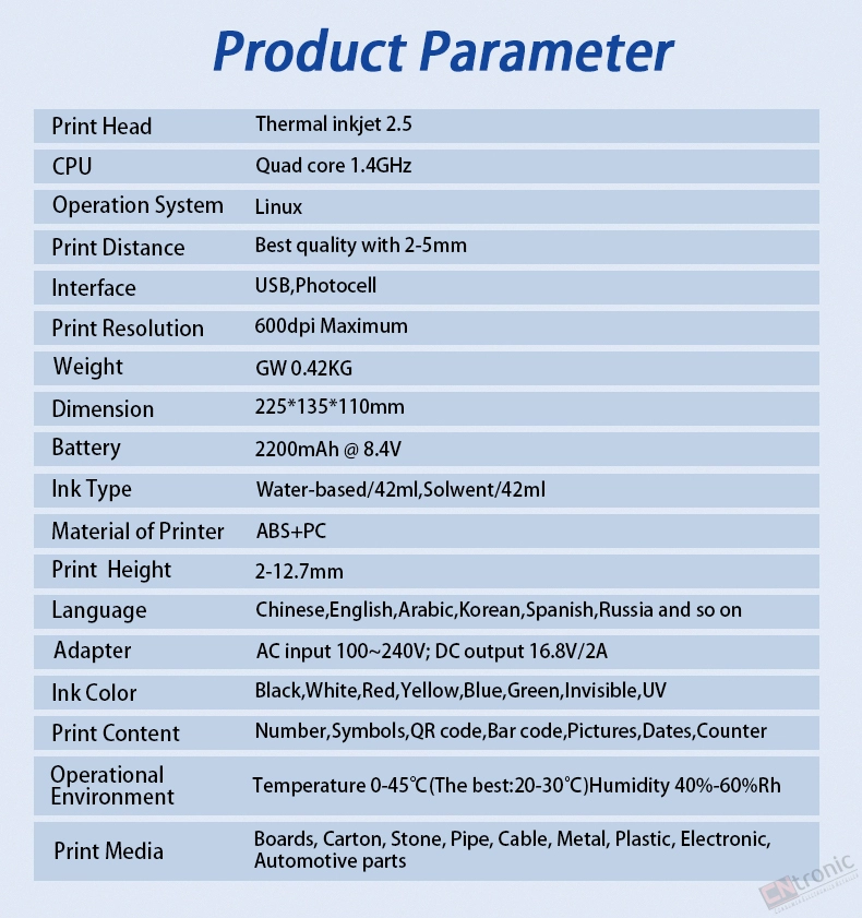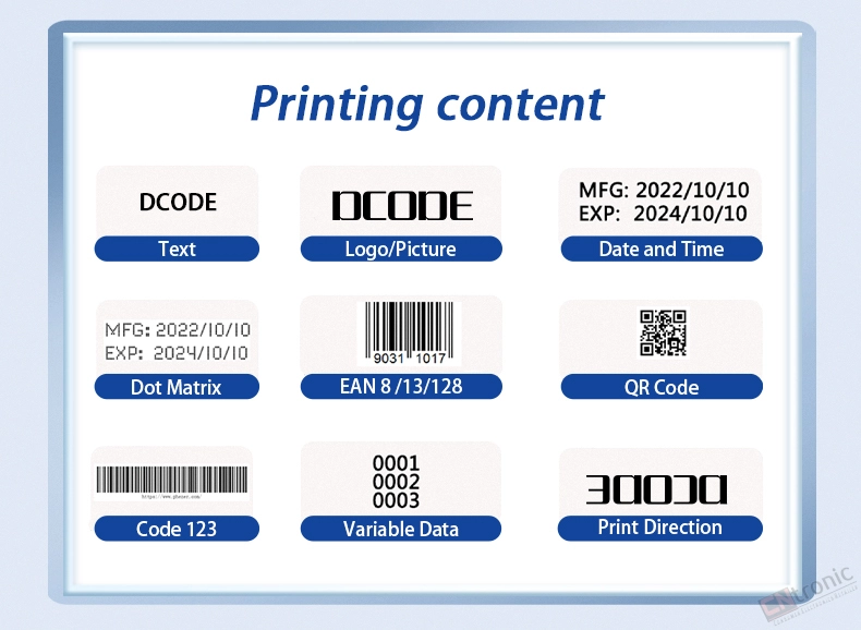 - Diverse Print Content: Time, Date, Counter, QR code, Barcode, Logo, Number, Symbol, Picture, etc.