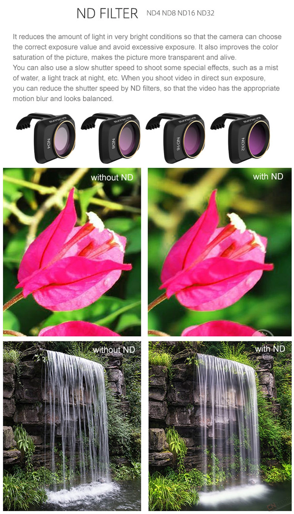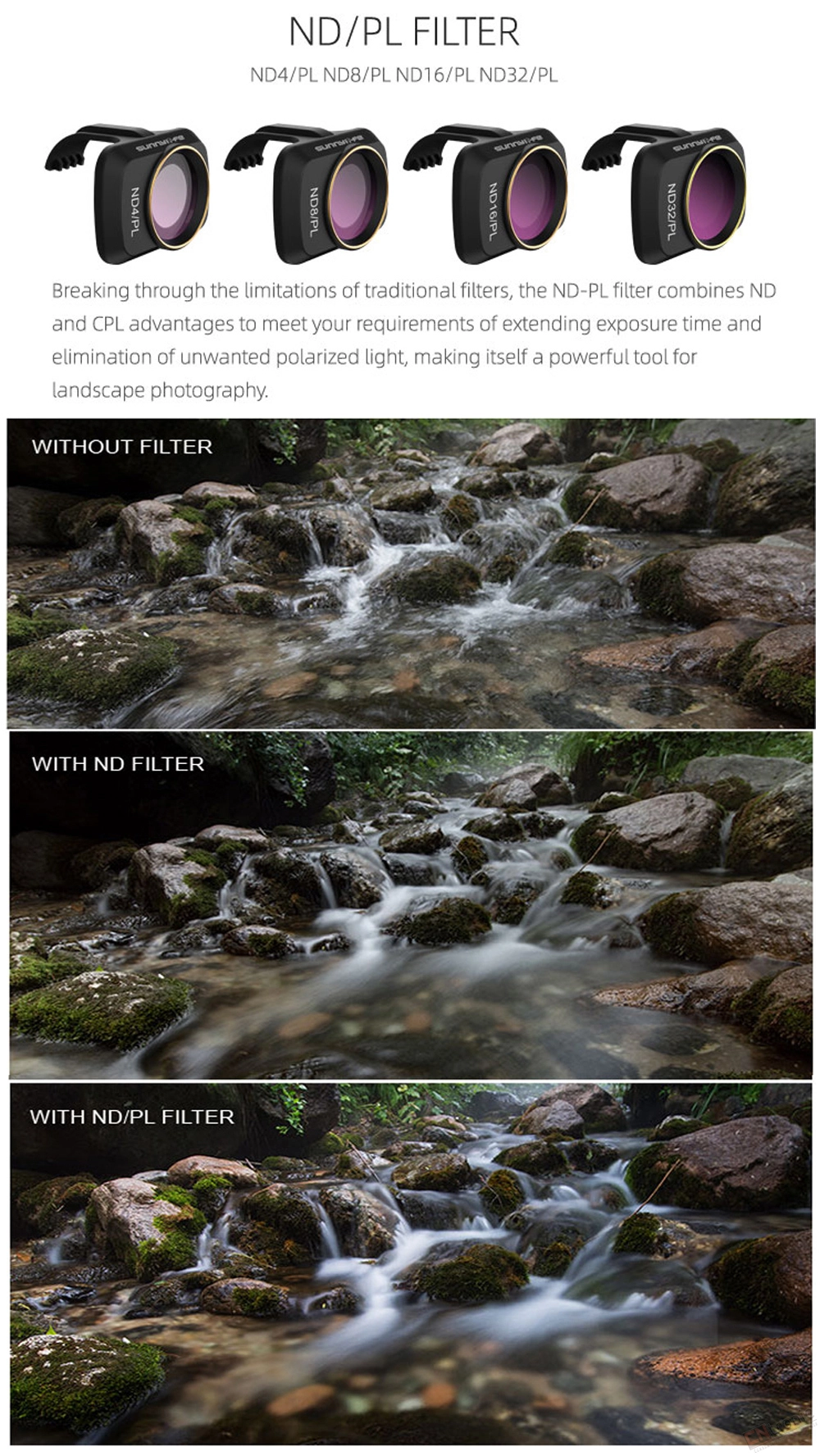 Breaking through the limitations of traditional filters ,the ND-PL filter combines ND and CPL advantages to meet .your requirements of extending exposure time and elimination of the unwanted polarized light ,making it salf a powerful tool for landscape photography