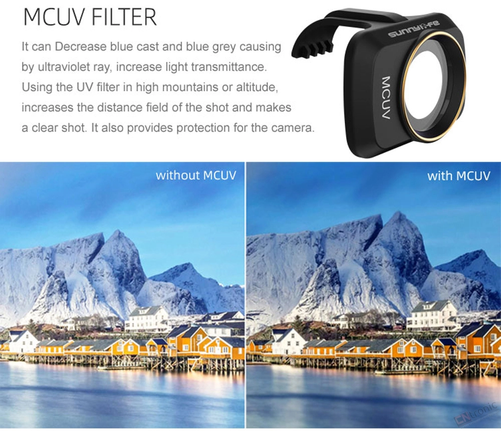 It Can Decrease blue cast and blue grey causing by ultraviolet ray,increase light transmittance. Using the UV Filter in high mountains oraltitude,increases