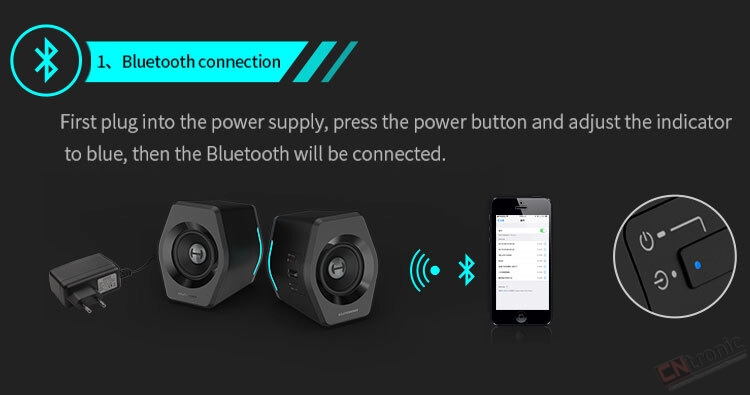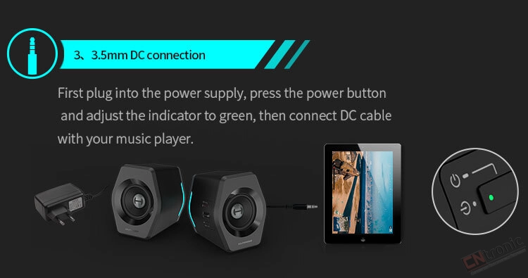— First plug into the power supply, press the power button and adjust the indicator to green, then connect DC cable with your music player.