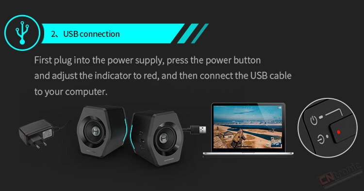 — First plug into the power supply, press the power button and adjust the indicator to red, and then connect the USB cable to your computer.