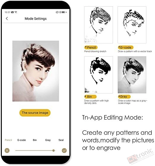 --You can select all the picture engraving in the mobile phone on the app, or transfer the picture or vector material to a G-code file through the computer and transfer it to the mobile phone. After converting the G-code file, the engraving speed will be accelerated: JPG, PNG, JPEG Wait.