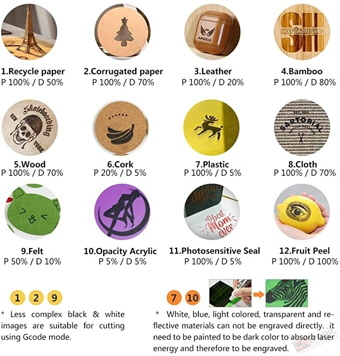 --Laser woodpecker can be carved on non-metal soft materials such as cardboard, cork, cloth, felt, leather, wood, plastic, EVA, etc. (White, blue and highly reflective materials need to be blackened with black whiteboard Re-engraving)