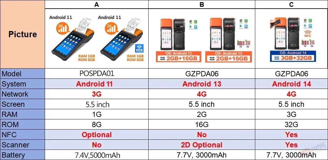 Optional C: Android 14(4G)+RAM3G RAM32G+NFC+2D Scanner