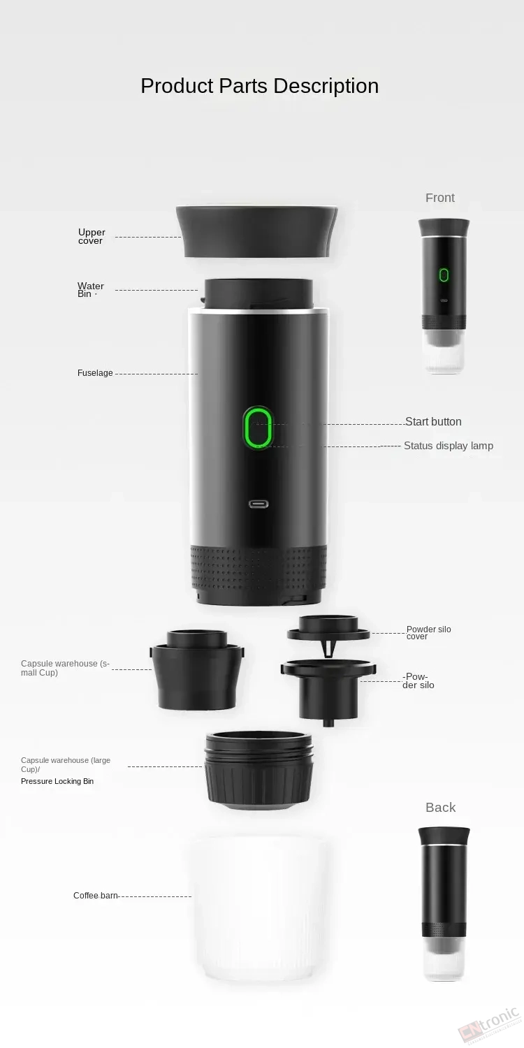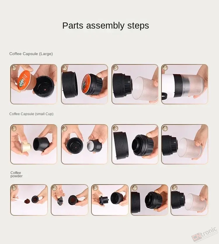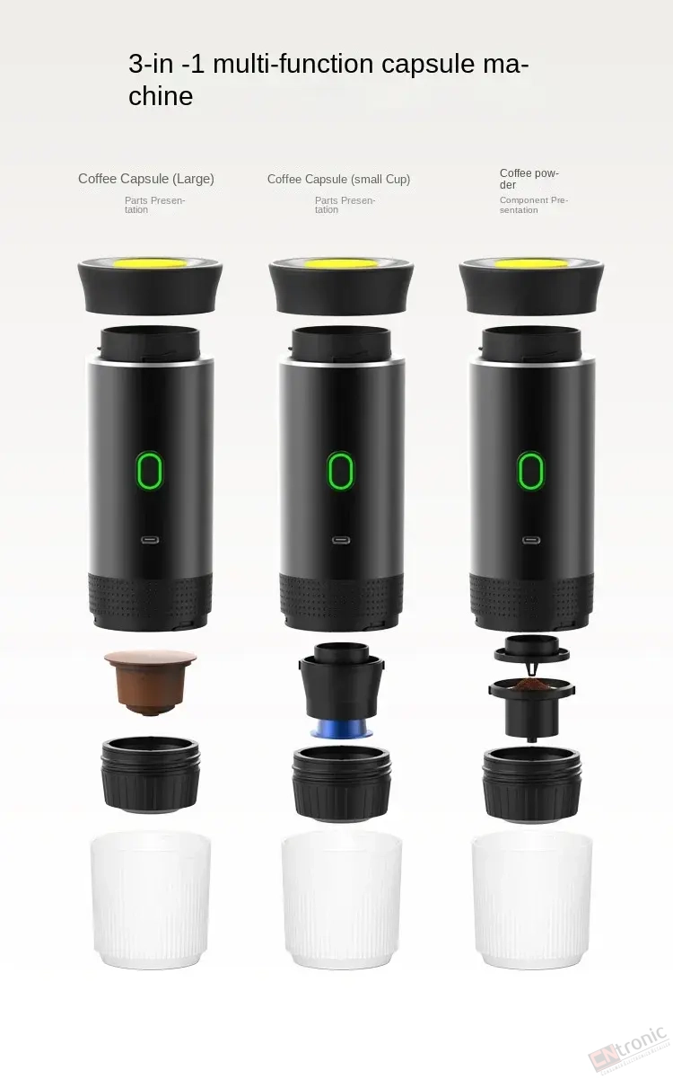 【Multi-compatible】The 3-in-1 portable espresso machine is equipped with a ground coffee compartment and a capsule compartment, which is compatible with small and large capsules and ground coffee.