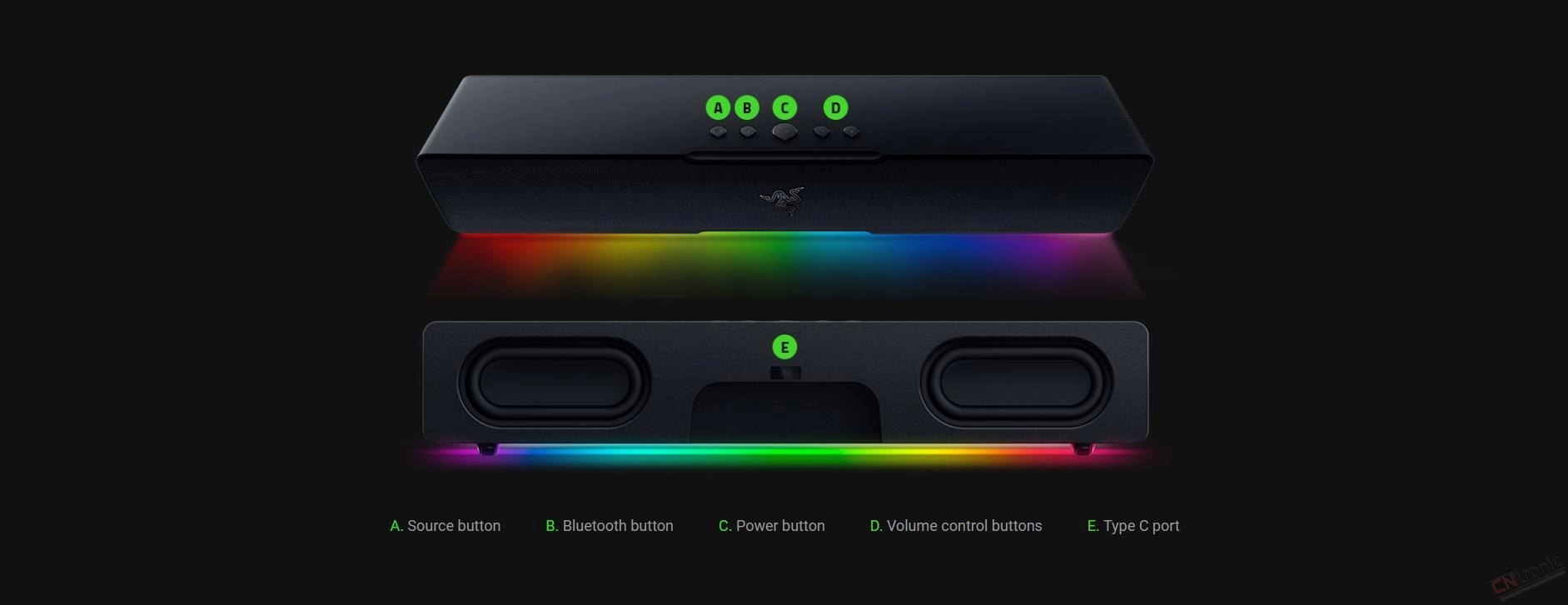 A. Source button,B. Bluetooth button,C. Power button,D. Volume control buttons,E. Type C port