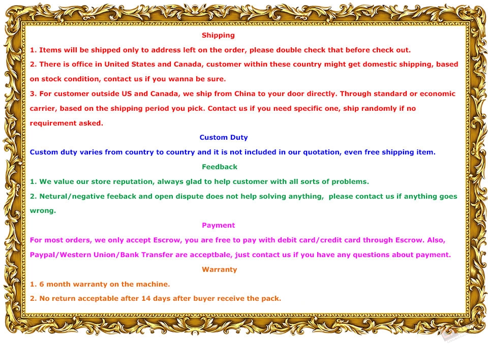 We are not responsible for any custom fees once the items have shipped. By purchasing our products, you consent that one or more packages may be shipped to you and may get custom fees when they arrive to your country.
