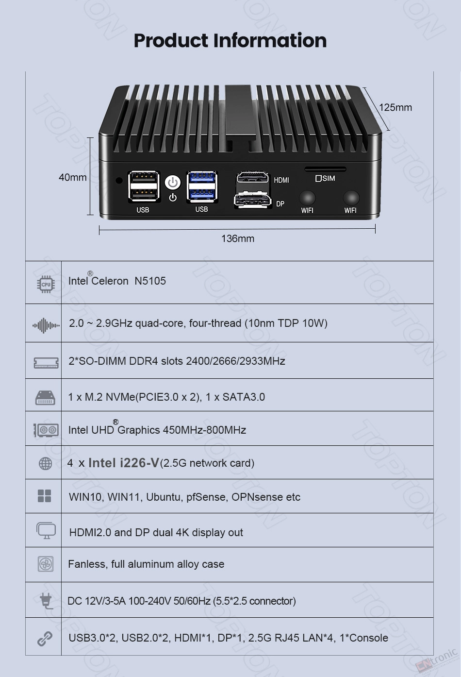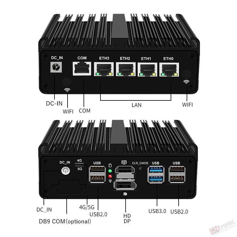 -4xIntel i226-V 2.5G RJ45 LANs, 2xUSB3.0, 4xUSB2.0, 1xRJ45 COM console, 1x5G SIM slot, 1x4G/3G SIM slot, DB9 COM RS232 or RS485 is optional to buy.