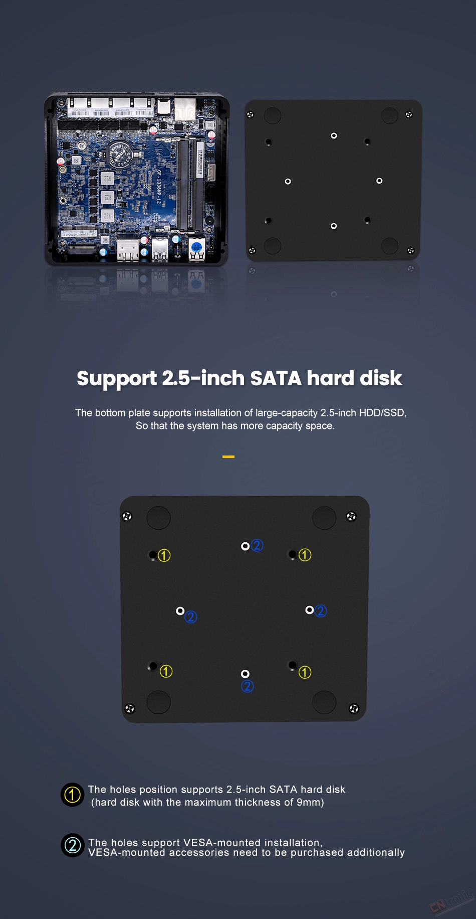 -Support two storage: 1xM.2 NVMe/PCIe3.0x1 2280 SSD+1x2.5''SATA3.0 7mm SSD/HDD.