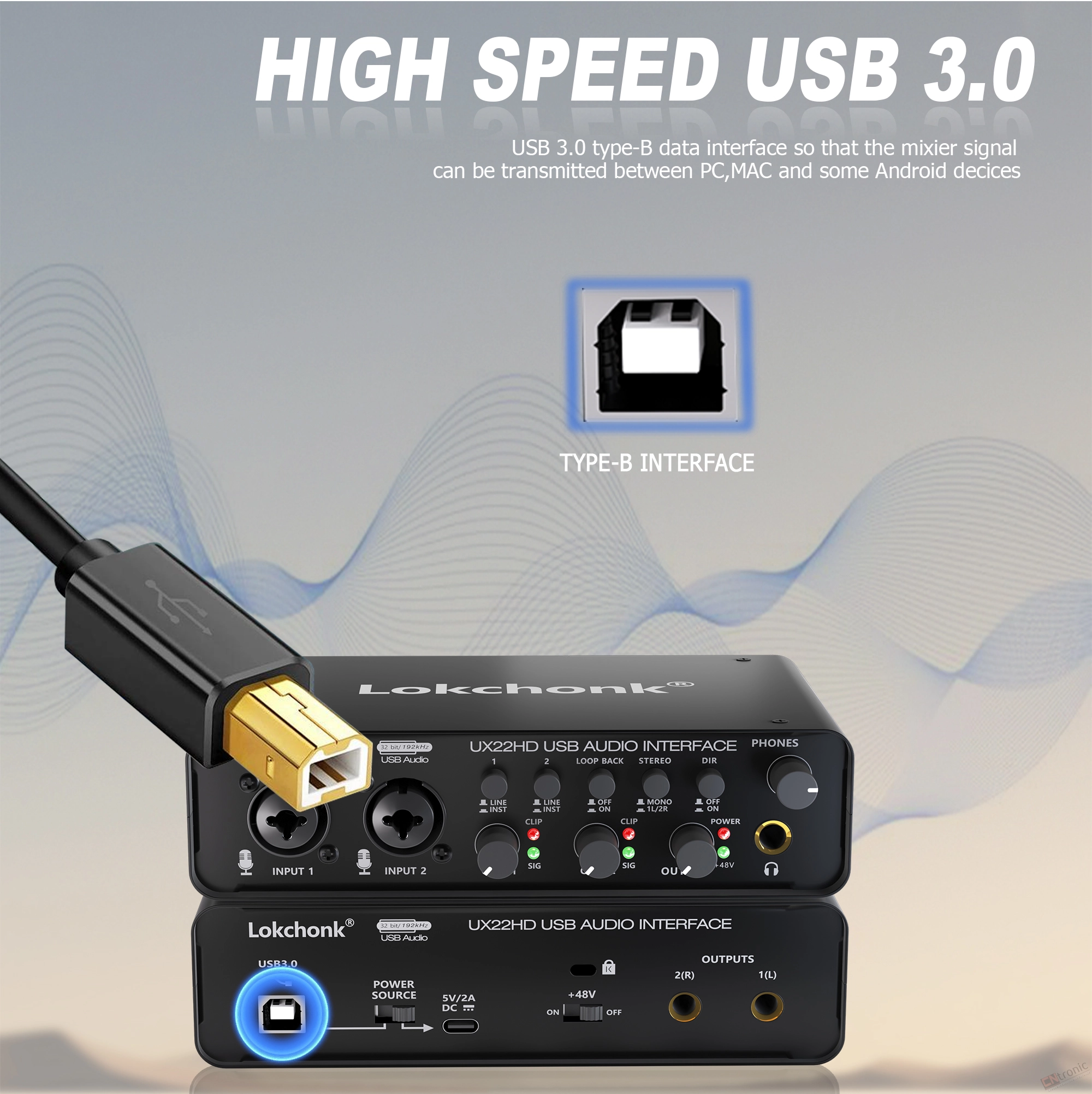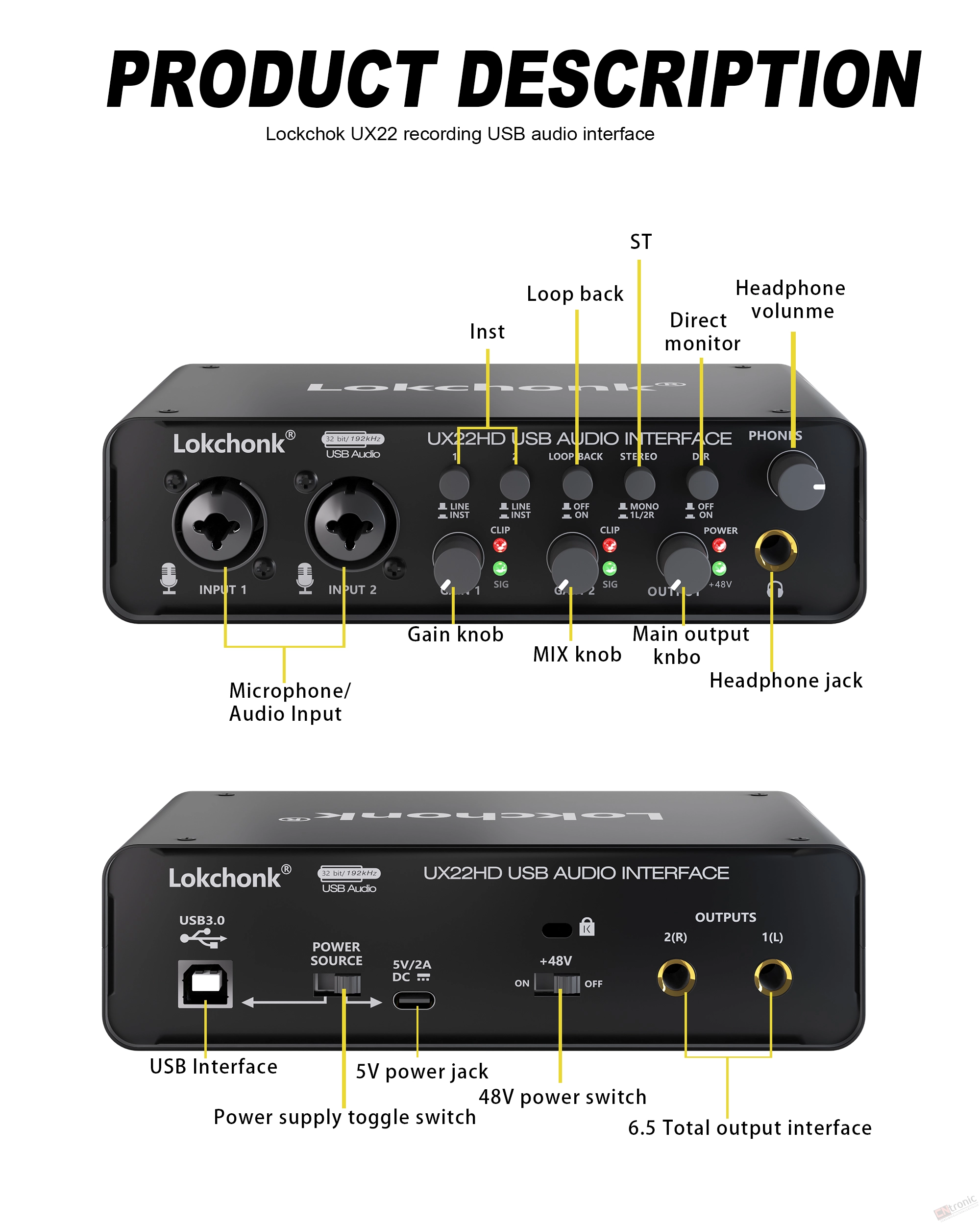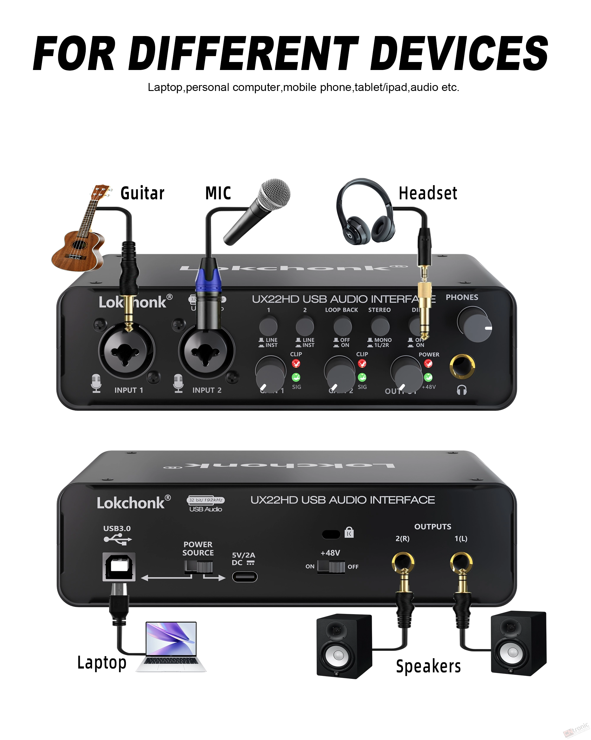 ✅【48V phantom power and microphone preamp】This USB audio interface has a built-in 48V phantom power and microphone preamp. It can be used with a separate boutique preamplifier, with lots of headroom, low distortion, and ultra-low noise. Both mic preamps have independent volume control knobs, signal indicators, overload indicators, and quick fade buttons. By using condenser microphones, you'll be able to inject excellent clarity and detail into your recordings. Perfect for picking up a guitar or recording vocals