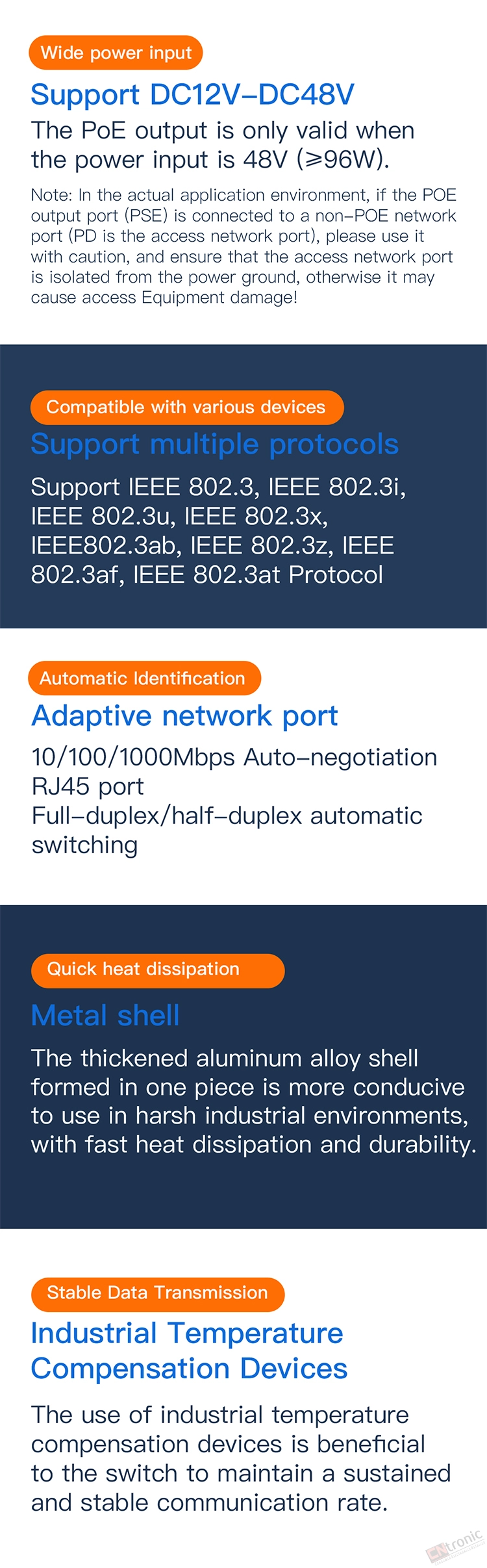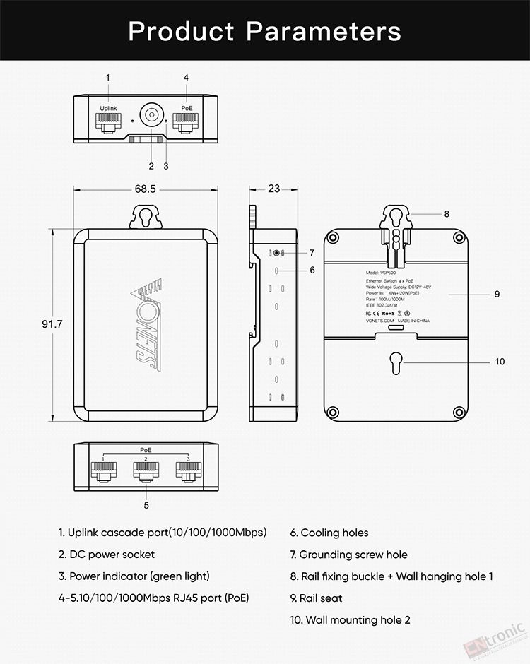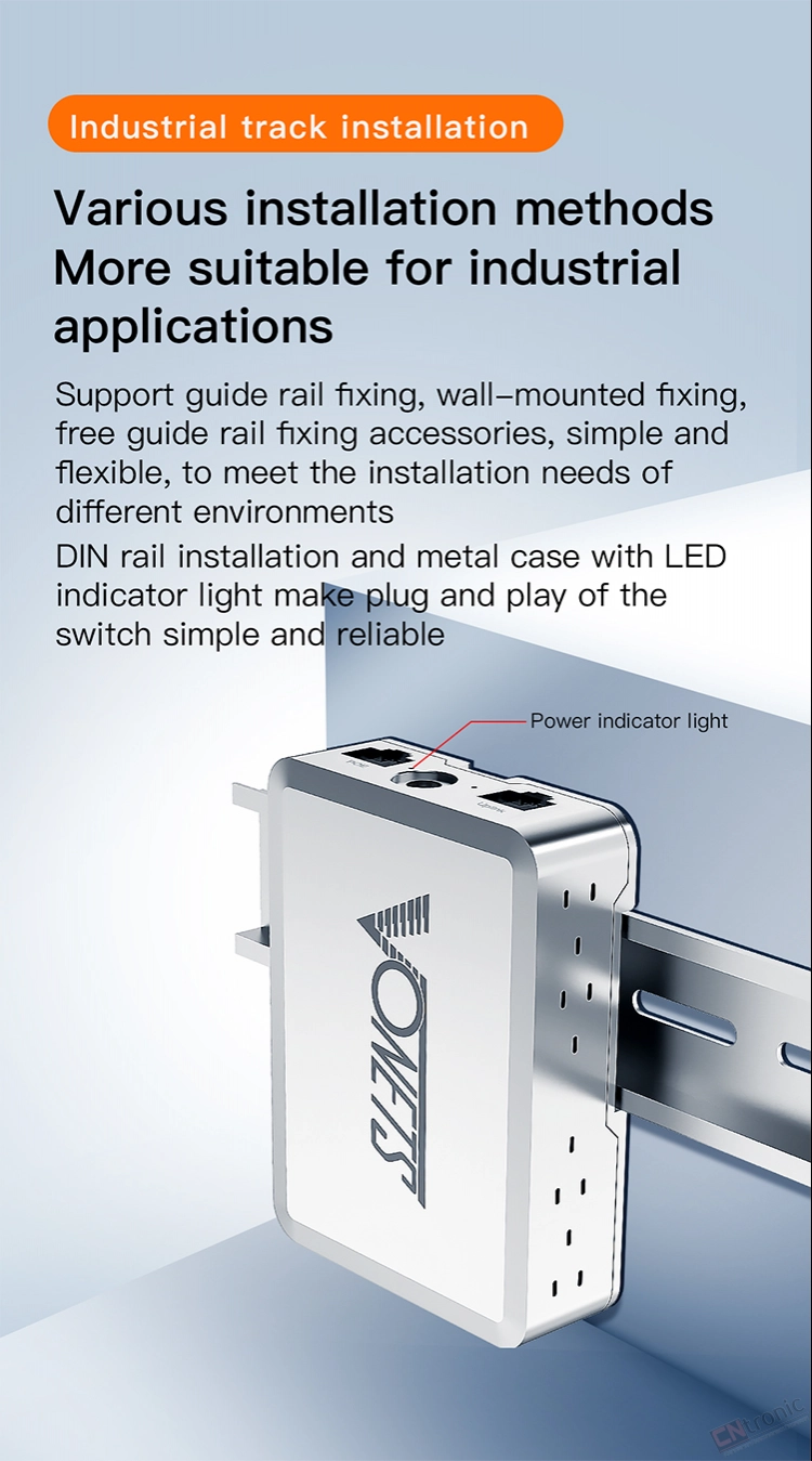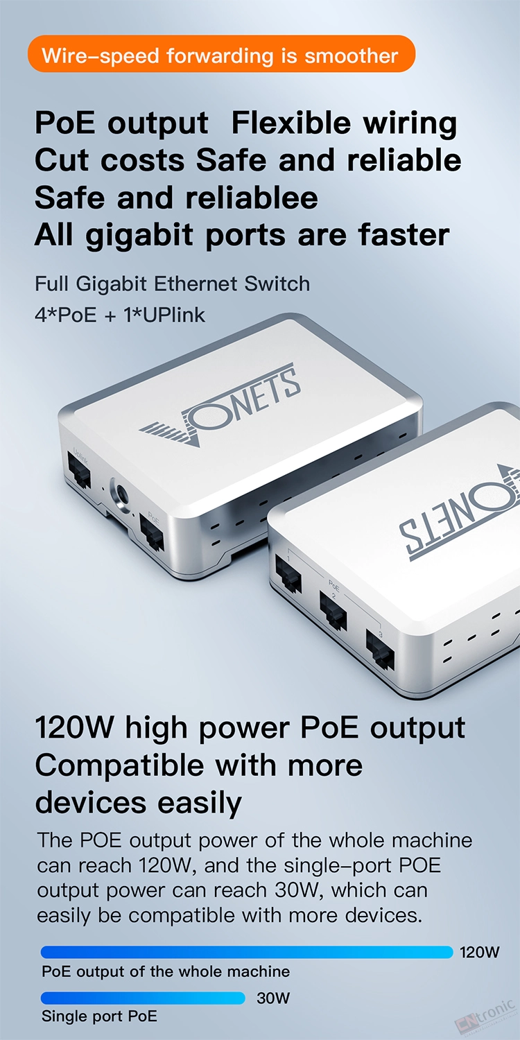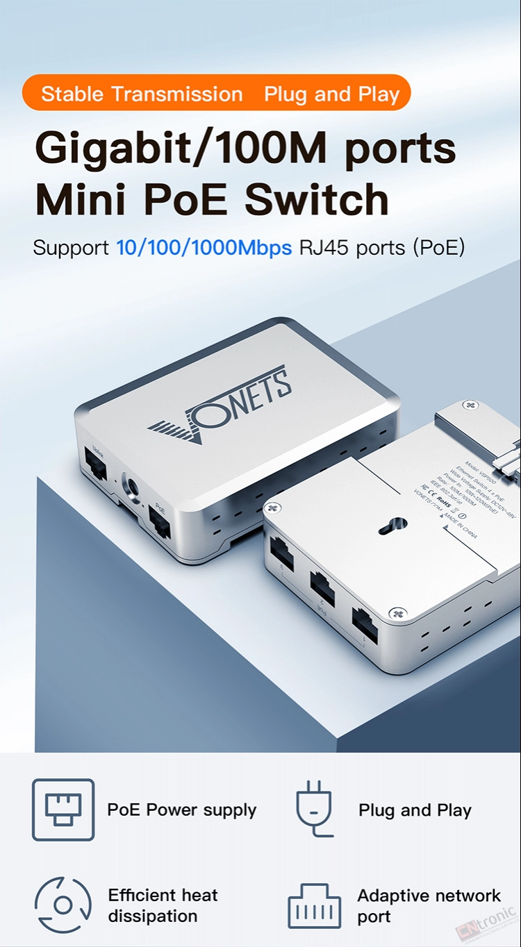 VONETS VSP500 Gigabit 5-Port Metal Housing Security Monitoring POE Mini Switch Splitter Diverter Hub